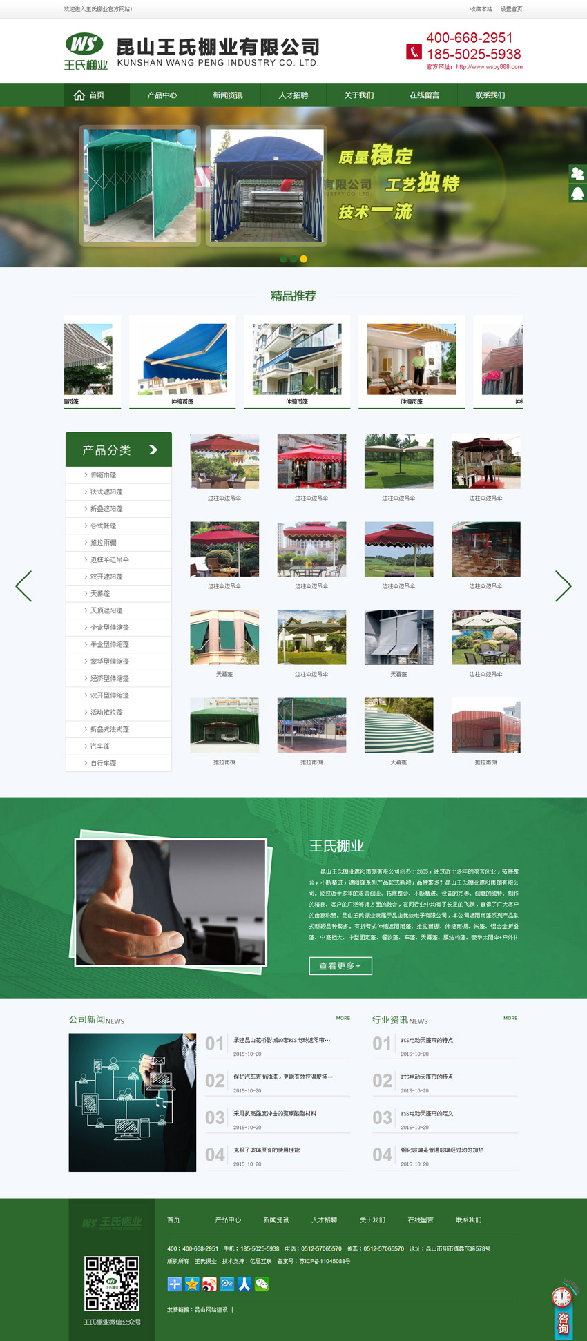 昆山王氏棚業(yè)遮陽雨棚有限公司創(chuàng)辦于2005,經(jīng)過近十多年的艱苦創(chuàng)業(yè)、拓展整合、不斷精進、設(shè)備的完善、創(chuàng)意的獨特、制作的精良、客戶的廣泛等諸方面的融合,在同行業(yè)中均有了長足的飛躍,贏得了廣大客戶的由衷稱贊。昆山王氏棚業(yè)遮陽雨蓬系列產(chǎn)品款式新穎品種繁多。有折臂式伸縮遮陽雨蓬、推拉雨棚、伸縮雨棚、帳篷、鋁合金折疊蓬、中高檔大、中型固定蓬、餐飲蓬、車蓬、天幕蓬、膜結(jié)構(gòu)蓬、豪華太陽傘+戶外休閑家具、遮陽蓬、遮雨蓬、展示蓬、大型停車蓬等。如:手搖式、電控式、光雨控式。