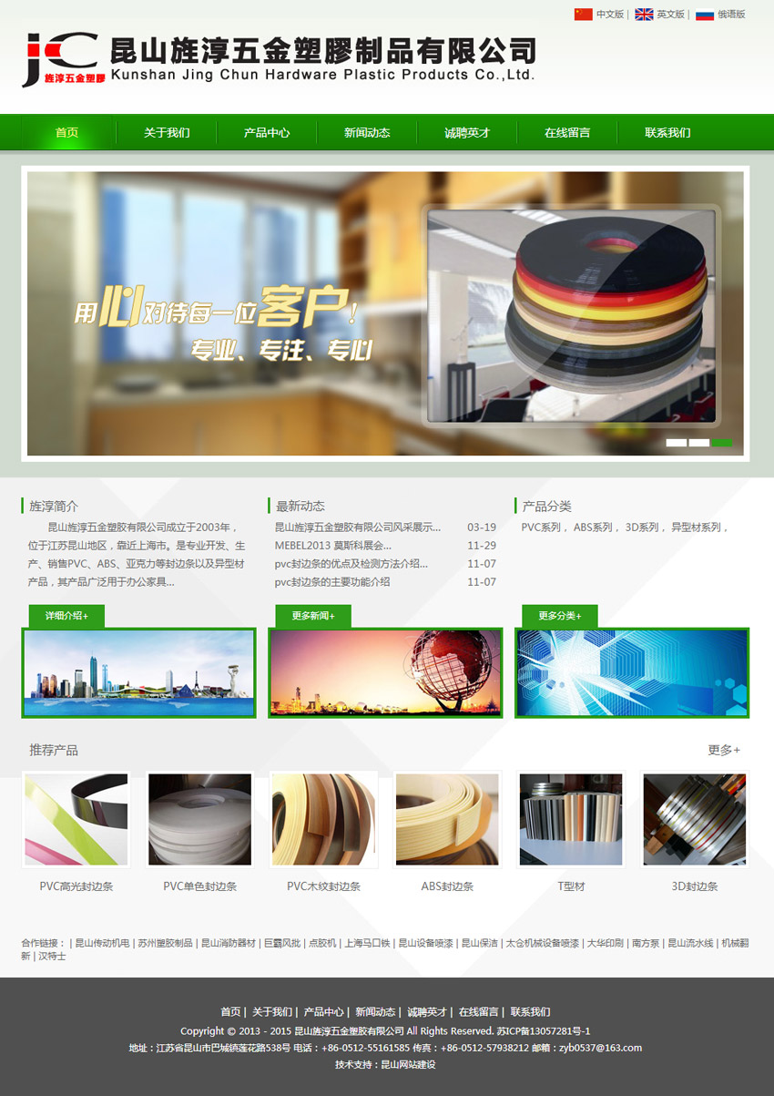 昆山旌淳五金塑膠有限公司成立于2003年,位于江蘇昆山地區(qū),靠近上海市。是專業(yè)開發(fā)、生產(chǎn)、銷售PVC、ABS、亞克力等封邊條以及異型材產(chǎn)品,其產(chǎn)品廣泛用于辦公家具、櫥柜、教具、室內(nèi)裝修等領(lǐng)域。隨著技術(shù)的不斷提高以及產(chǎn)品樣式的增加,我們的封邊條產(chǎn)品從質(zhì)量上和價(jià)格上都能滿足各類客戶的需求!